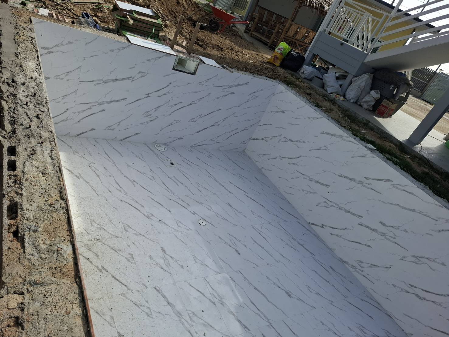 Der Pool ist bis auf den Pumpenbereich fertig, die Gästehäuser sollen bis max. nächste Woche fertig sein. Dann geht es an Wege und Einfahrt, sowie Bepflanzung des Geländes.