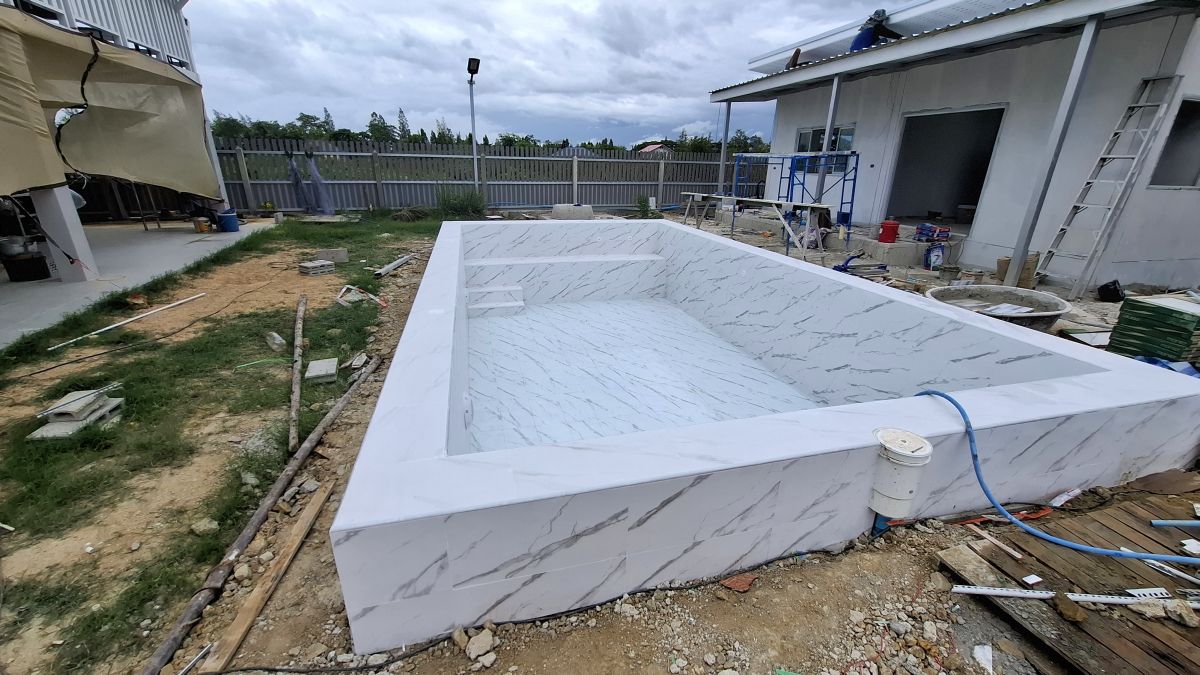 Der Pool ist bis auf den Pumpenbereich fertig, die Gästehäuser sollen bis max. nächste Woche fertig sein. Dann geht es an Wege und Einfahrt, sowie Bepflanzung des Geländes.