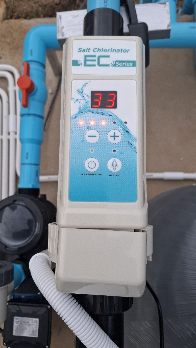 Ebenso ist das Poolhaus für Pumpen, Geräte und Salzlager mit Außendusche fertiggestellt.
